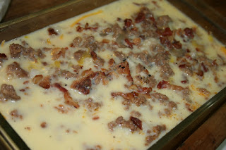 | A yummy breakfast casserole that can be put together at the last minute - hash browns, sausage or ham, onion, bacon, milk, eggs, salt and pepper - what more could you want to start the day?! |